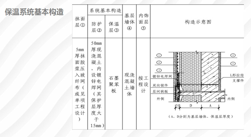 接镀锌电焊网并将其与保温层(石墨聚苯板)置于固定位置、施工现场在保温层两侧同时浇筑混凝土基层墙体及防护层,使防护层与保温层内侧的现浇混凝土基层墙体可靠连接,形成的具有保温、防护作用的构造系统。简称为“双向锁件拉结内置保温系统”。